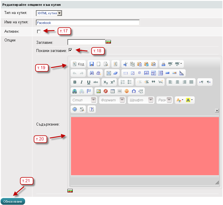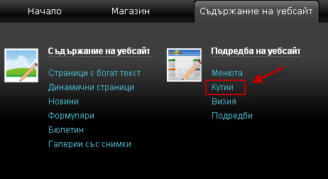 - Ще направим нова XHTML кутия в която ще поставим кода. За целта отидете в меню Съдържание на уебсайт -> Кутии