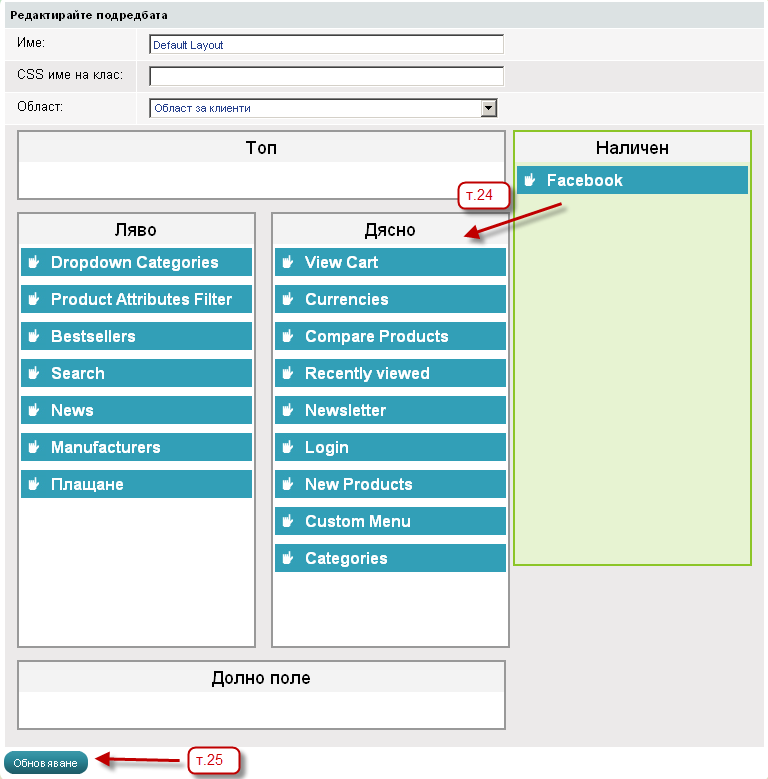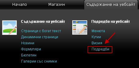 - Остава само да включим кутията в клиентската част. За целта отворете менюто Съдържание на уебсайт -> Подредби