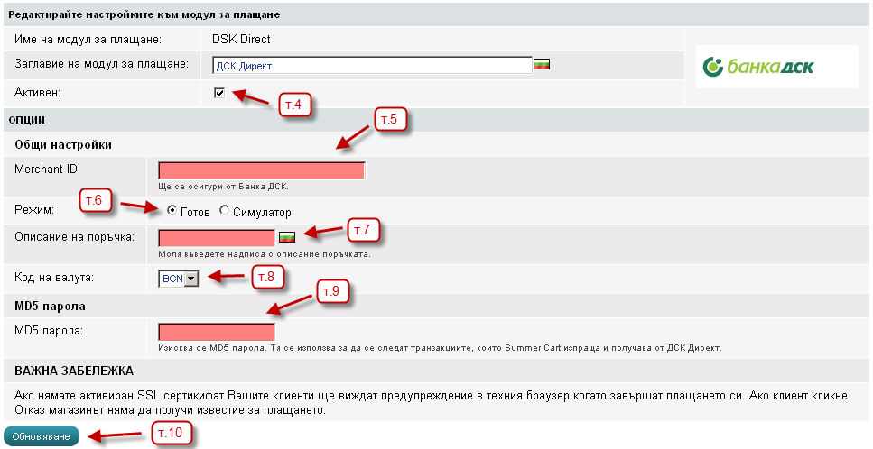 - Срещу MD5 парола въведете произволна парола, по възможност по-сложна и я пратете на банката. Тази парола се използва за да се следят транзакциите, които Summer Cart изпраща и получава от ДСК.