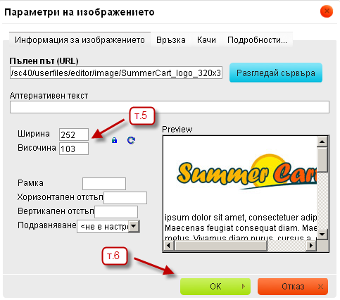 - Натиснете върху бутона - OK. На следващата страница запазете настройките. Картинката вече е видима в клиентската част.