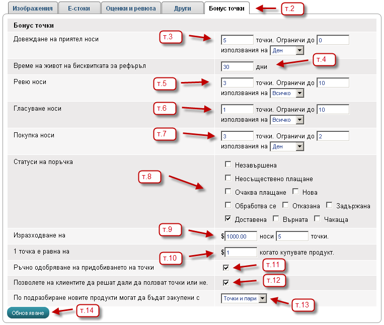 - От следващата страница изберете таба - Бонус точки и пред Вас ще се зареди страницата с всички настройки на бонус точките.