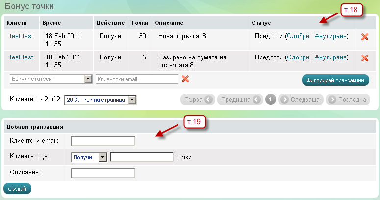 - Ако от т.11 сте избрали да одобрявате ръчно точките, това става от менюто Магазин -> Бонус точки.