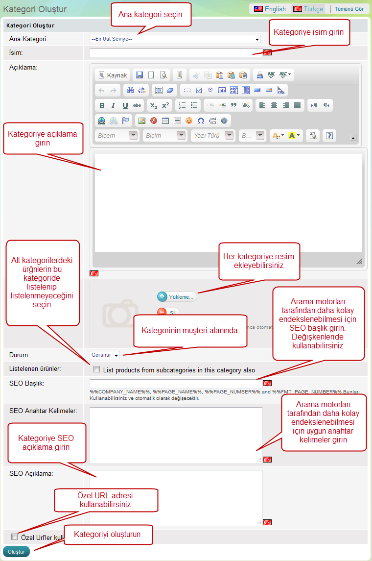 Öneri: Kategorilere ne kadar fazla bilgi girerseniz Google, Yahoo, Bing gibi arama motorları için çok daha yararlı olacak.