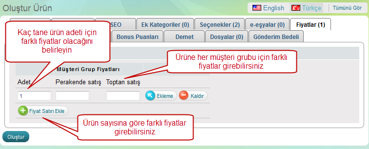 Bu bölümde farklı müşteri grupları için farklı fiyatlar girebilirsiniz. Fiyatları farklı ürün adetlerine (5, 10, 15 gibi) girebilirsiniz. Bu şekilde farklı müşteri grupları için farklı fiyatlar görünebilir.