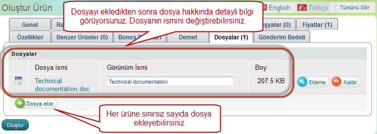 Her ürüne ek bilgi için dosyalar ekleyebilirsiniz. Ayrıca ürüne farklı kullanım klavuzları ekleyebilirsiniz. Çeşitli komutlar yürütebilinen dosyalar hariş her türlü dosya yükleyebilirsiniz. Güvenlik açısından çeşitli komutlar yürütebilinen dosyalar eklenemez.