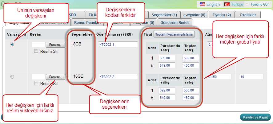 Öneri: Ürünlerin değişkenleri(çeşitleri) var ise ürün miktarı, fiyatı ve ağırlığı "Değişkenler" bölümünden yönetilir.