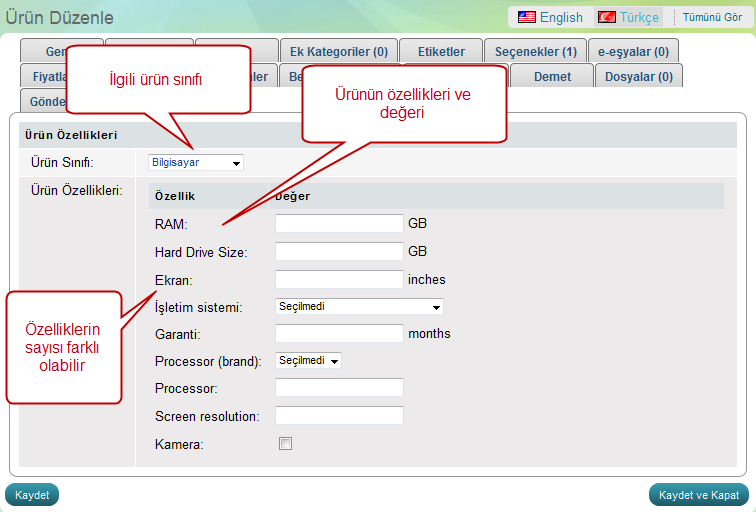 Öneri: Oluşturduğunuz özelliklere doğru bilgiler girirseniz müşterileriniz sitede filtreleme ve arama seçenekleri ile aradıkları ürünleri kolayca bulabilirler.