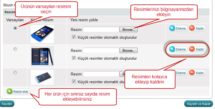 Her ürün için sınırsız sayıda resim ekleyebilirsiniz. Resimler otomatik olarak mağaza ayarlarında belirttiğiniz genişlik ve yükseklik ayarlarına göre güncellenecekler.