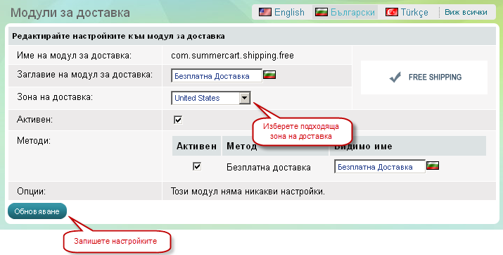 'Модули за доставка', Опции