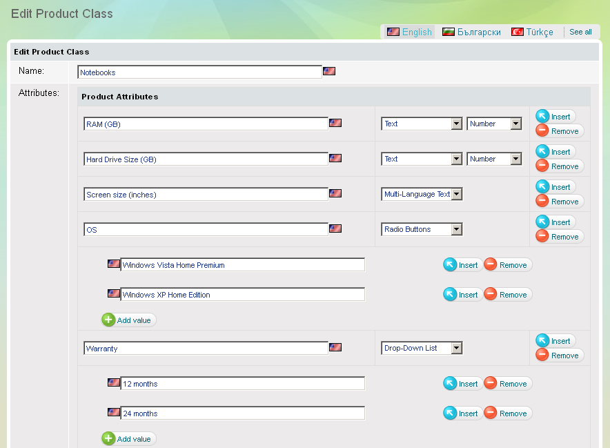Use 'Product classes' page to create a new product class (e.g. Notebooks) and define the belonging attributes (e.g. operating system, weight, CPU speed, display size, etc). You can also edit or delete a product class, as well as add, edit and delete specific product attributes. You can use 5 types of attributes