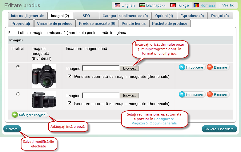 Tabul 'Imagini' în pagina 'Editare Produs'