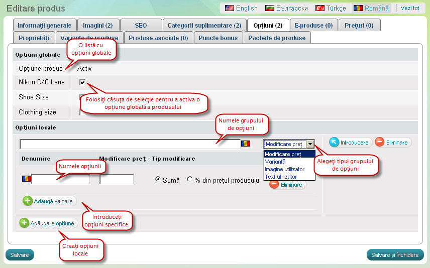 Opţiunile Locale ale unui produs - puteţi crea şi aplica aceste opţiuni unui singur produs. Acestea vor fi imediat vizibile în interfaţa magazinului, în pagina produsului respectiv.