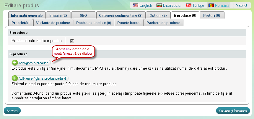 Pagina 'Editare produs' este organizată în 13 taburi care vă permit să schimbaţi cu uşurinţă detaliile produsului: General, Imagini, SEO, Categorii adiţionale, Opţiuni, Bunuri Virtuale, preţuri, proprietăţi, variante, produse înrudite, puncte bonus, pachete produse.