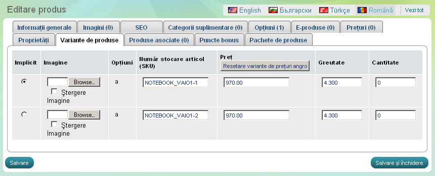 Aici puteţi încărca o poză pentru fiecare variantă în parte, puteţi seta un cod de bare pentru fiecare produs(SKU), preţul, greutatea şi cantitatea în stoc.
