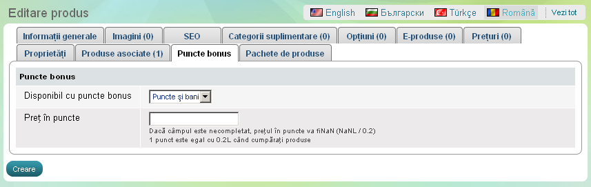 Tabul 'Puncte Bonus' în pagina 'Editare Produse'