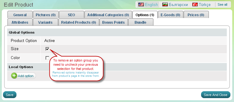 la capătul rândului. Se va deschide pagina 'Editare produse'. - Deschideți tabul 'Opțiuni' și folosiți căsuța de selecție pentru a înlătura grupurile de opțiuni nedorite.