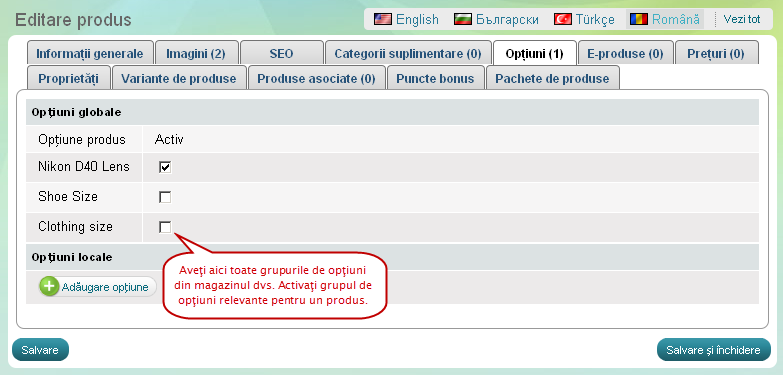 . Se va deschide pagina 'Editare Produs'. - Deschideţi tabul Opţiuni şi selectaţi unul sau mau multe grupuri de opţiuni din listă existentă.
