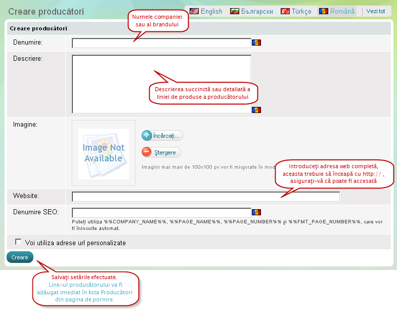 - Click pe butonul Producător nou din antetul paginii. Se va deschide pagina 'Creare producător'.