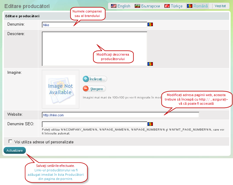 . Se va deschide pagina 'Editare producător'. - Aplicaţi schimbările dorite în orice dintre câmpurile disponibile.