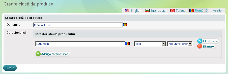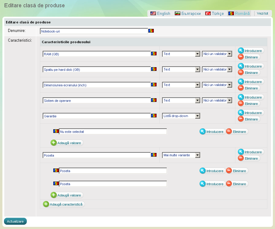 Folosiţi pagina 'Clase produse' pentru a crea o nouă categorie de produse (de ex. notebook) şi definiţi proprietăţile (sistemul de operare, greutatea, viteza procesorului, dimensiunea ecranului, etc.). Deasemenea, puteţi şterge o clasă de produse, dar puteţi şi să editaţi sau să ştergeţi anumite proprietăţi ale produsului. Puteţi adăuga până la 5 proprietăţi.