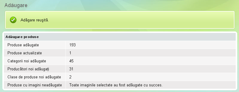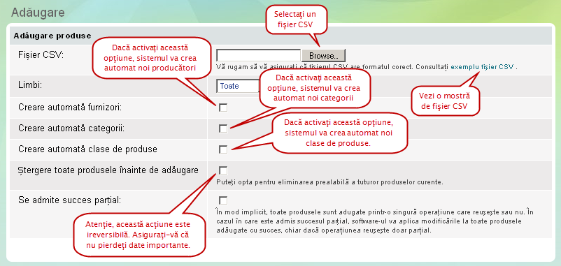 - "Auto-creare" - dacă magazinul are deja producători, categorii sau clase de produse, iar una nouă este listată în fișierul CVS, sistemul va crea suplimentar noi producători, categorii și clase de produse în magazinul dvs.