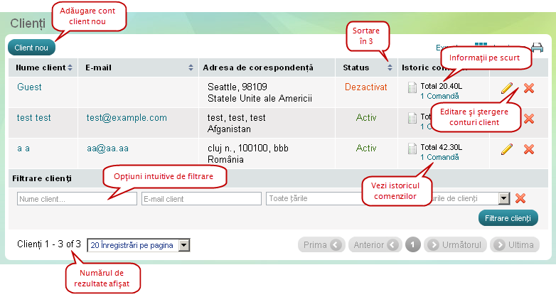 Dispuneţi de 3 moduri de a aranja conturile clienţilor în ordine aşcendentă şi deşcendentă: după nume, după adresă de email şi după ţară. Pentru a sorta clienţii trebuie doar să faceţi click pe