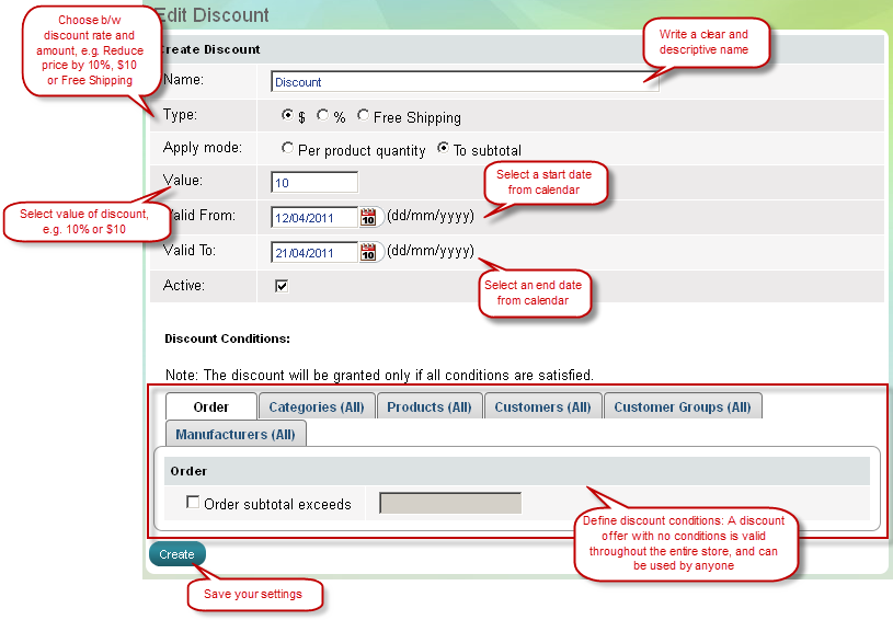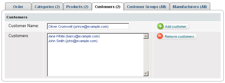 Puteţi aplica 6 condiţii de reducere cu ajutrul a 6 taburi: tabul Comenzi, tabul Categorii, tabul Produse, tabul Clienţi, tabul Grupuri clienţi şi tabul Producători. Puteţi folosi o condiţie sau puteţi combina mai multe pentru a vă axa pe clienţi ţintă. Puteţi oferi reduceri pentru un grup de produse ca şi lichidare vânzări sezoniere sau să setaţi o reducere pentru clienţii fideli. Reducerea va fi valabilă doar atunci când toate condiţiile sunt îndeplinite.