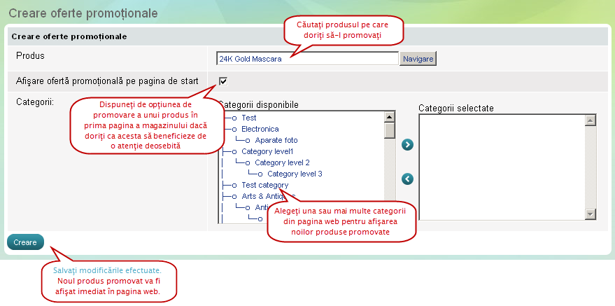 Cum adăugaţi un produs promovat Mergeţi la meniul magazinului, la 'Promoţii' click pe link-ul Produs...