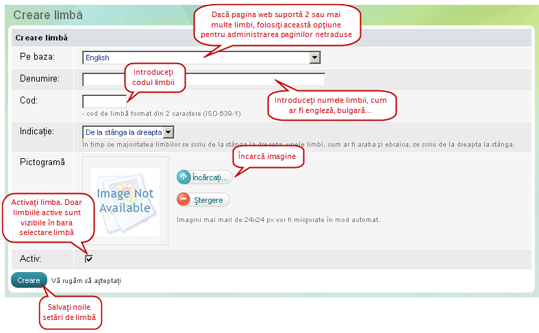 - Click pe butonul 'Limbă nouă' din partea de sus a paginii. Se va deschide pagina 'Creare limbă'