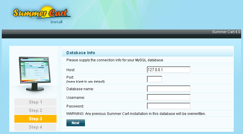 Вече имаме всичко необходимо - потребителско име, парола и база данни. Въведете данните и натиснете бутона Next