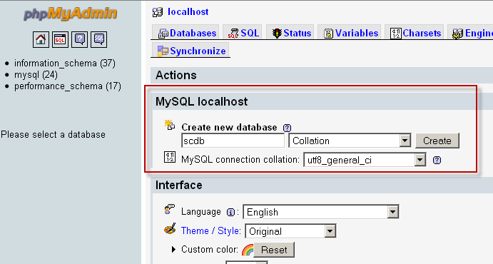 - След като имаме име и парола за да преминем на следващата стъпка ни е необходима и база данни. Намерете полето Create new database, въведете произволно име(ние ще въведем scdb) и натиснете върху бутона Create за да създадете новата база от данни.