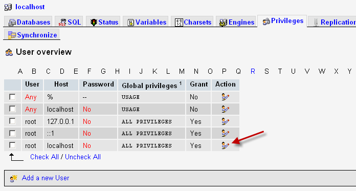 на адрес - http://localhost/phpmyadmin/ и отворете таб - Privileges Кликнете върху иконка