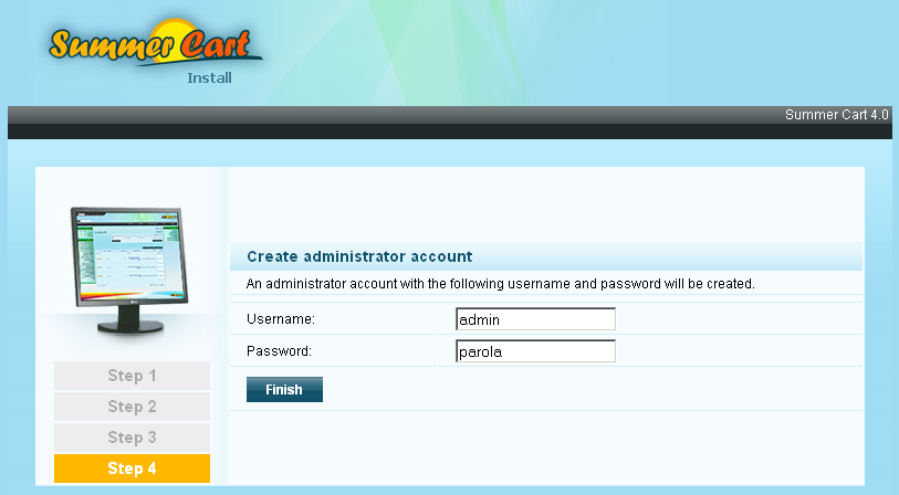 Въведете потребителското име и парола, които искате да ползвате за вход в административния панел на Summer Cart и натиснете Finish за да завършите инсталацията.