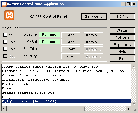 като стартирате XAMPP, ще се покаже прозореца от снимката отдолу. Натиснете върху Start бутона срещу Apache и MySQL за да ги стартирате. Ако всичко е наред ще се покажат два надписа Running.