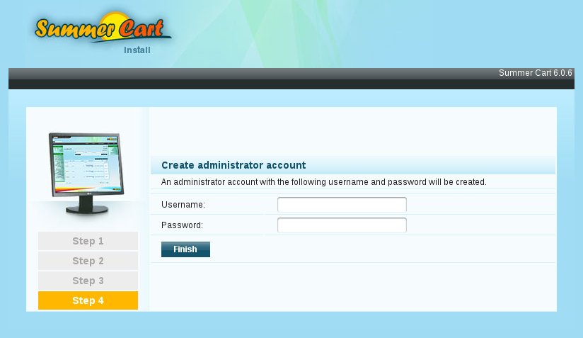 В стъпка 4, помощника за инсталация изисква от Вас да създадете администраторски акаунт за достъп до административния панел на Summer Cart.