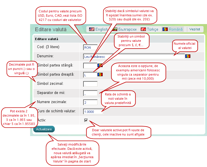 - Mergeţi la meniul Setări, la 'Limbi şi valute multiple' click pe link-ul Valute.
