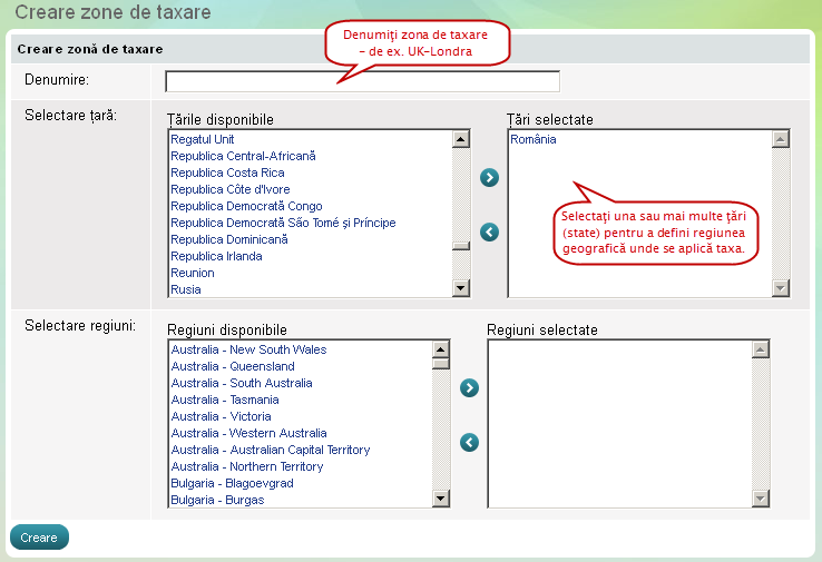- Click pe butonul 'Zonă nouă de taxe' aflat la mijlocul paginii.