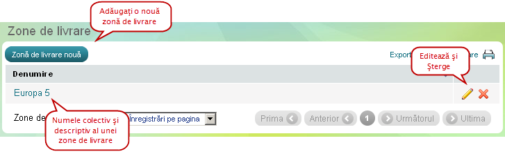 Pagina 'Zone de livrare' afişează toate grupurile de destinaţii către care livraţi produse.