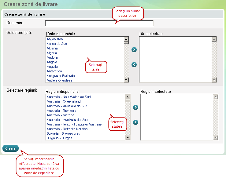 | Pont: | O nouă zonă de livrare va putea fi utilizată efectiv doar dacă alocaţi acea zonă unui modul de expediere din pagina 'Module de expediere'. |