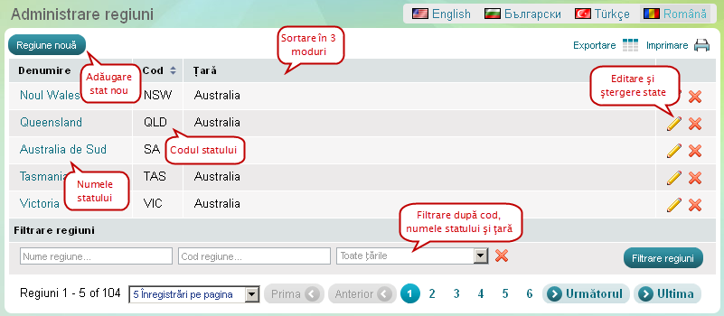 Folosiţi pagina'State' pentru a vedea, adăuga, edita şi şterge unităţile regionale ale unei ţări. Puteţi deasemenea să sortaţi şi să filtraţi regiunile după nume, cod şi ţară.