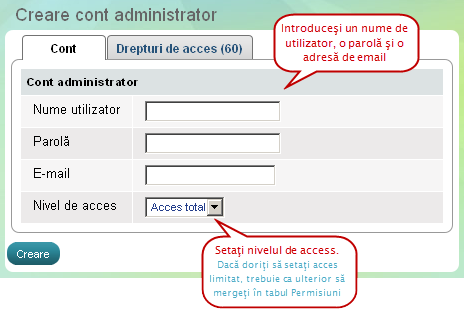Tabul 'Permisiuni' în pagina 'Creare administrator'