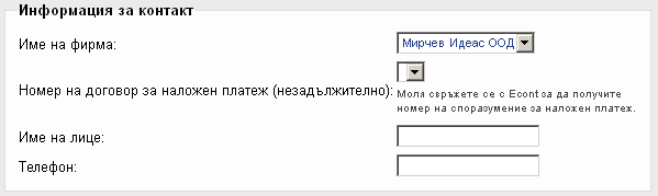 - Ако сте попълнили правилно потребителското име и паролата в раздел Потребител, срещу Име на фирма ще се появи наименованието на юридическото/физическото лице, идентично с изписването му във вашия клиентски кабинет, меню „Моят профил”. Ако разполагате с номер за изплащане на наложен платеж по банков път, моля изберете уникалният номер от падащото меню(подписването на Споразумение за изплащане на наложен платеж по банков път НЕ Е ЗАДЪЛЖИТЕЛНО условие за функционирането на модула). В полетата Име на лице и Телефон можете да въведете съответно име и телефон по ваш избор.