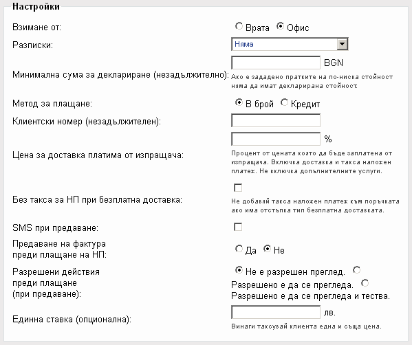 Имате възможност за допълнителни настройки на следните условия по доставката:- Обявена стойност - задайте обявена стойност на пратката.