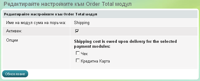 - Ако желаете платец на доставката да бъде Вашият клиент, то трябва да отворите меню Настройки -> Сума поръчка -> Shipping. Сложете отметка на опцията .