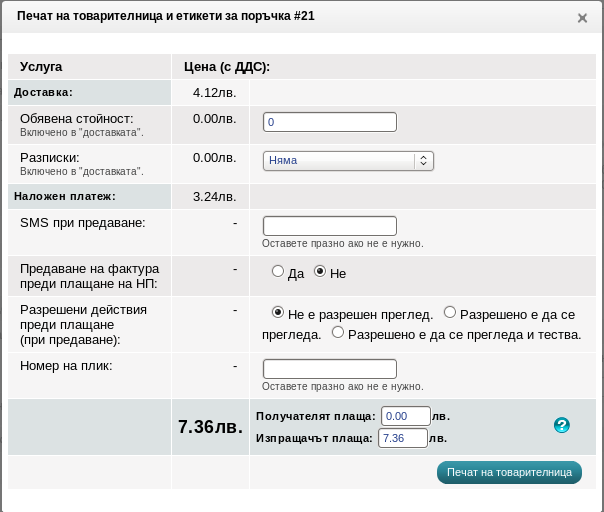 - Разписки - посочете дали искате да получавате обратна и стокова разписка след доставяне на пратката.
