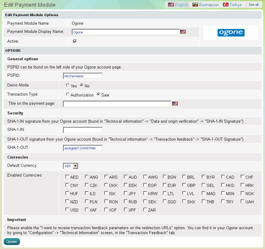 The Ogone module has 6 setup options that need to be completed before its activation: