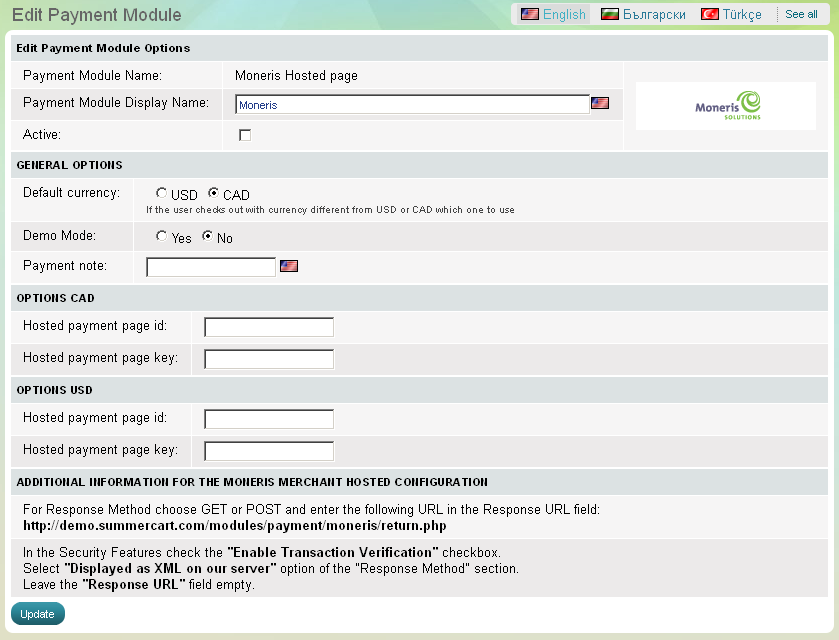 Summer Cart store owner is required to enter his or her Hosted payment page id and page provided by Moneris. |
