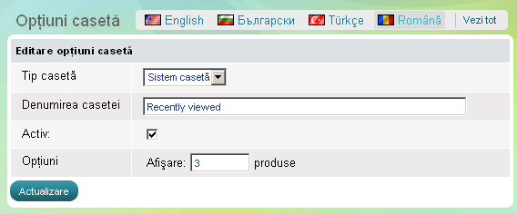 Folosiţi secţiunea 'Recent afişate' pentru ca vizitatorii paginii să poată vedea ultimele produse vizitate în pagina web. Vizitatorii nu pot vedea ce produse au văzut alţi vizitatorii, pot vedea doar lista cu produsele pe care le-au vizitat ei înşişi.