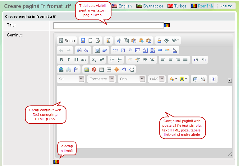 Puteţi adăuga cu uşurinţă text, grafică, tabele şi alte efecte vizuale într-o pagină cu ajutorul link-ului editor 'Ceea ce vezi este ceea ce ai'. Conţinutul paginii poate fi afişat în mai multe limbi. Pentru a adăuga mai multe limbi trebuie doar să faceţi click pe iconiţa-steag.