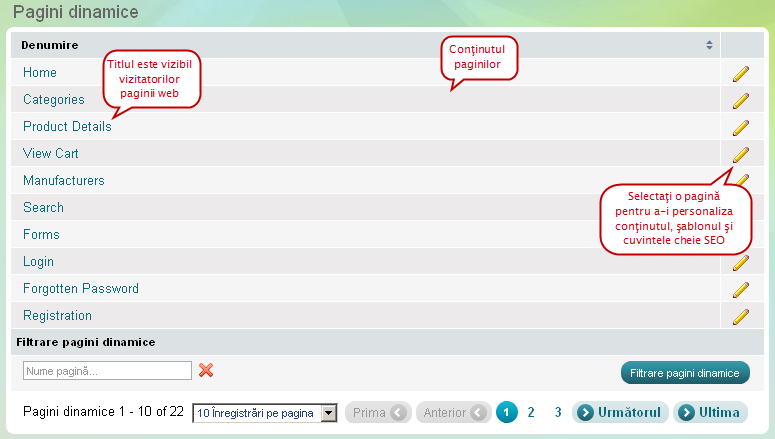 'Pagini dinamice' listează toate paginile din baza de date aflate în magazinul dvs. Summer Cart şi vă permite să personalizaţi anumite părţi din conţinut. Citiţi instrucţiuni detaliate în topicul 'Pagini dinamice personalizate'.